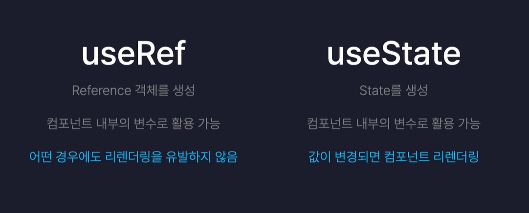 useRef 로 관리하는 값이 변경되어도 컴포넌트가 리렌더링 되지 않는다. 그래서 화면에 반영이 필요한 값은 보통 useState로, 그렇지 않으면 useRef 로 관리한다.